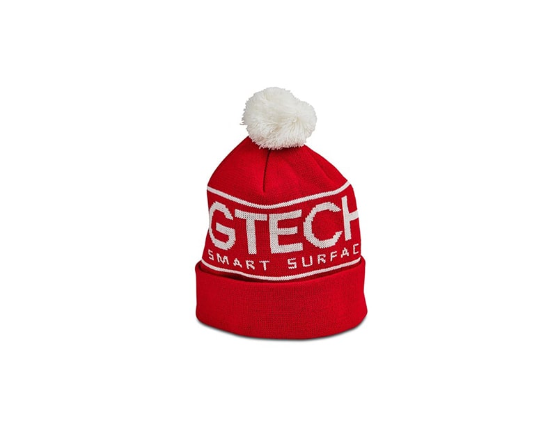 Red Gtechniq knitted bobble hat, with a white pompom and white logo.