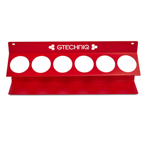 The wall-mounted bottle holder has been designed to hold 6, 500ml Gtechniq bottles. The unit is constructed of high-grade steel and has a matte red powder-coated finish. Each holder comes with a laser-cut Gtechniq logo and hexagon design. The bottle holder measures 495mm wide x 95mm deep x 180mm high. Wall mounting screws are not included.